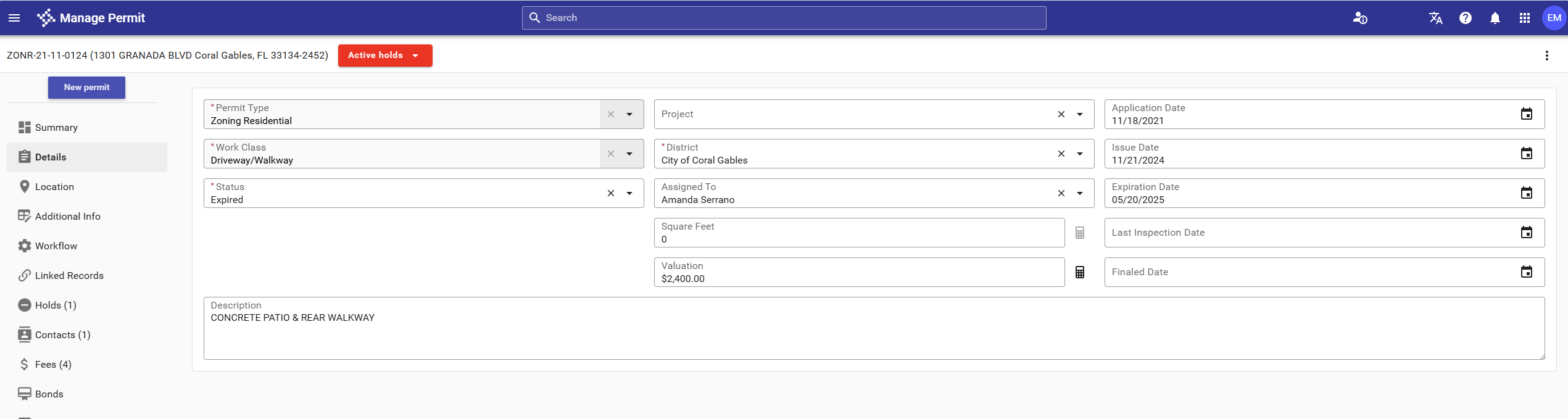 Code Enforcement Officer Comments - (EXP) Expired Permit ZONR-21-11-0124 CONCRETE PATIO & REAR WALKWAY.